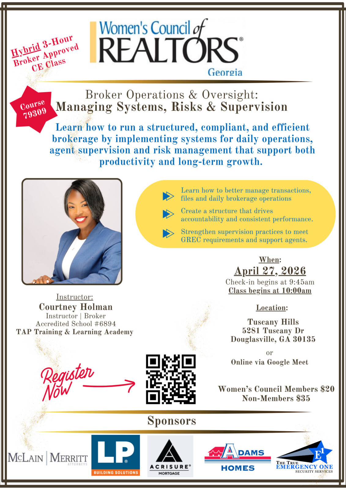 “Broker Operations & Oversight: Managing Systems, Risks & Supervision” provides a practical, systems-driven approach to running an efficient brokerage. Attendees will gain actionable insights into managing transactions, organizing brokerage operations, and implementing processes that drive accountability and consistency.
