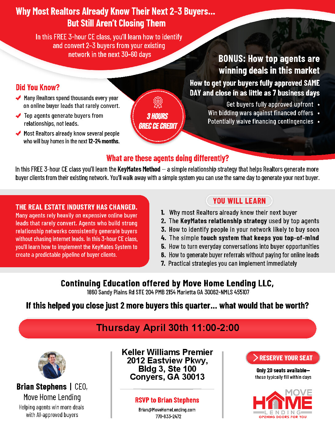 Our in-person meetings are held on the 1st Friday of every month at DeKalb Association of Realtors® (PEAR) located at 1414 Montreal Rd., Tucker, GA 30084, from 10:00 am to 11:00 am.